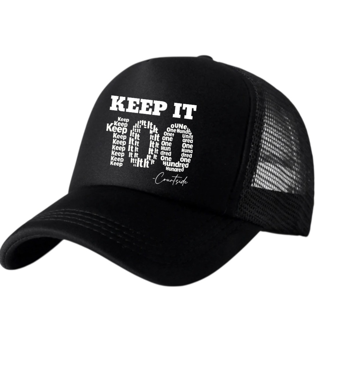 This classic “Keep It 100” trucker hat features a structured front panel paired with breathable mesh backing for all-day comfort. Designed with an adjustable snapback closure, it delivers a secure, customizable fit while maintaining a timeless look perfect for everyday wear.